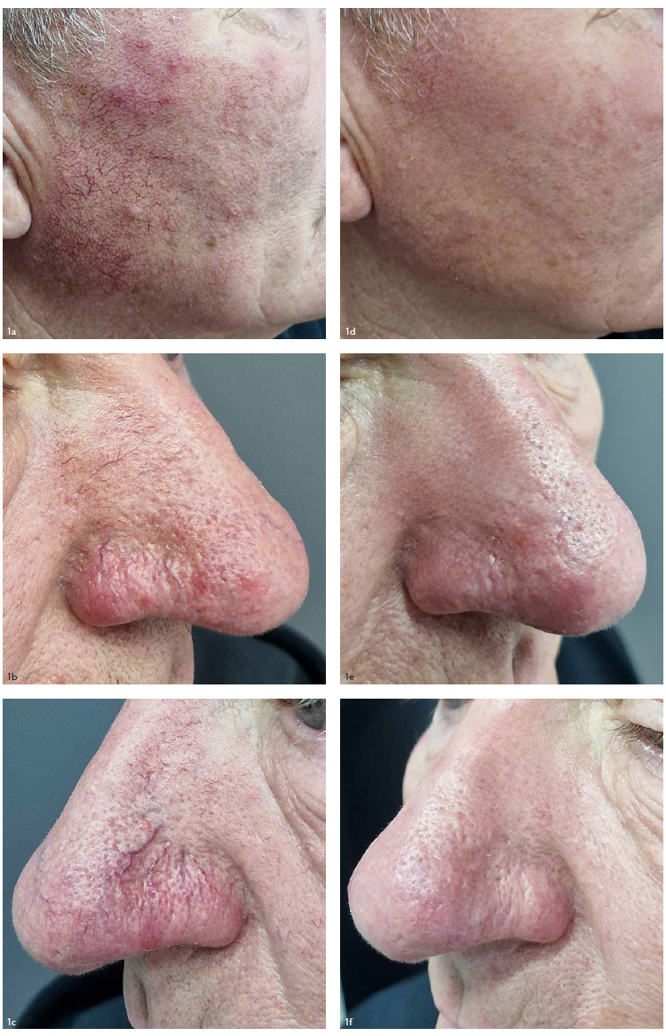 Анамнез: пациент на протяжении восьми месяцев получал системный изотретиноин, 20 мг/сут. Проводилось наружное лечение кремами с метронидазолом и ивермектином, применялись ингибиторы кальциневрина. Несмотря на комплексную терапию, сохранялись выраженные сосудистые проявления и эритема.